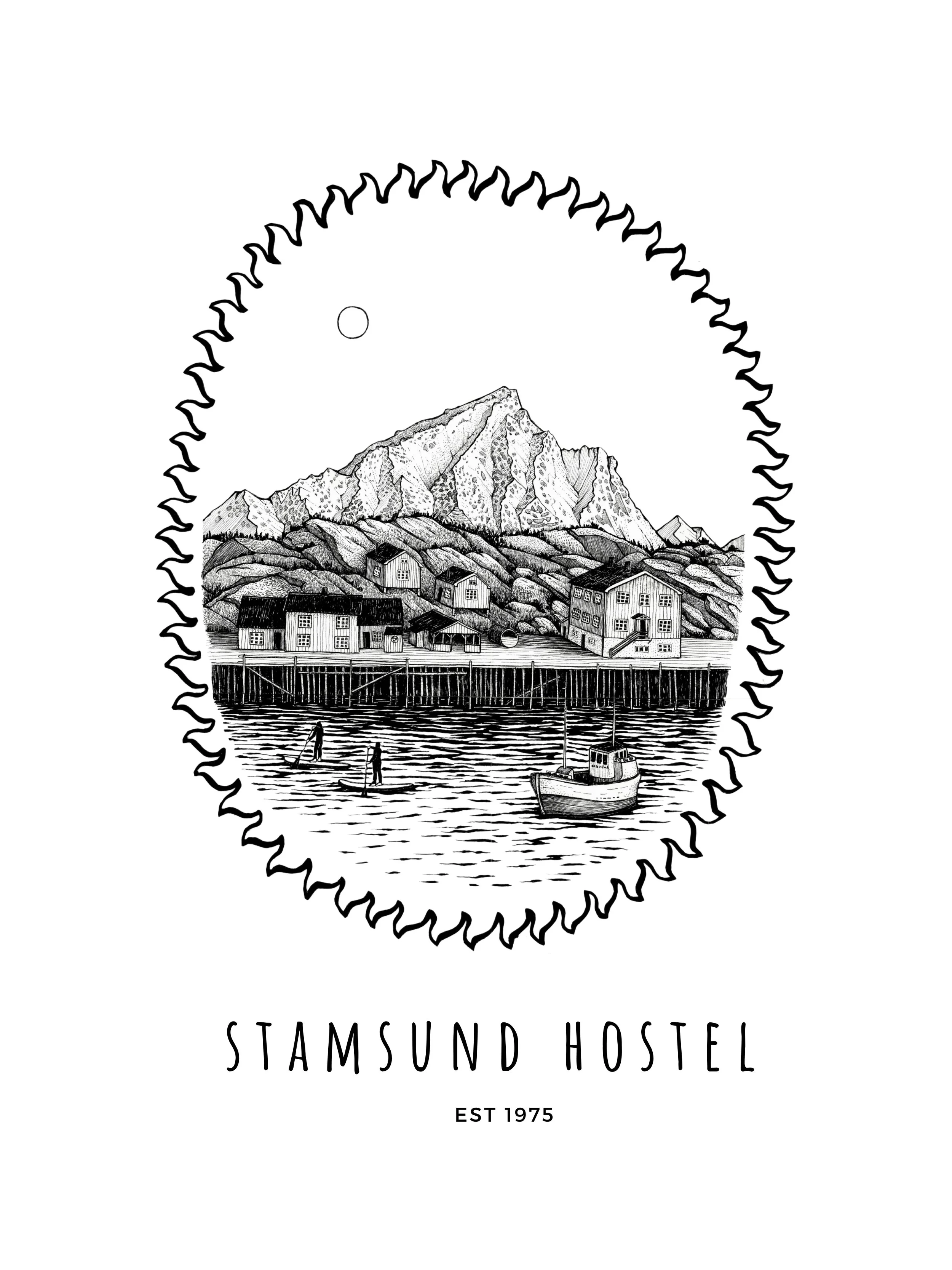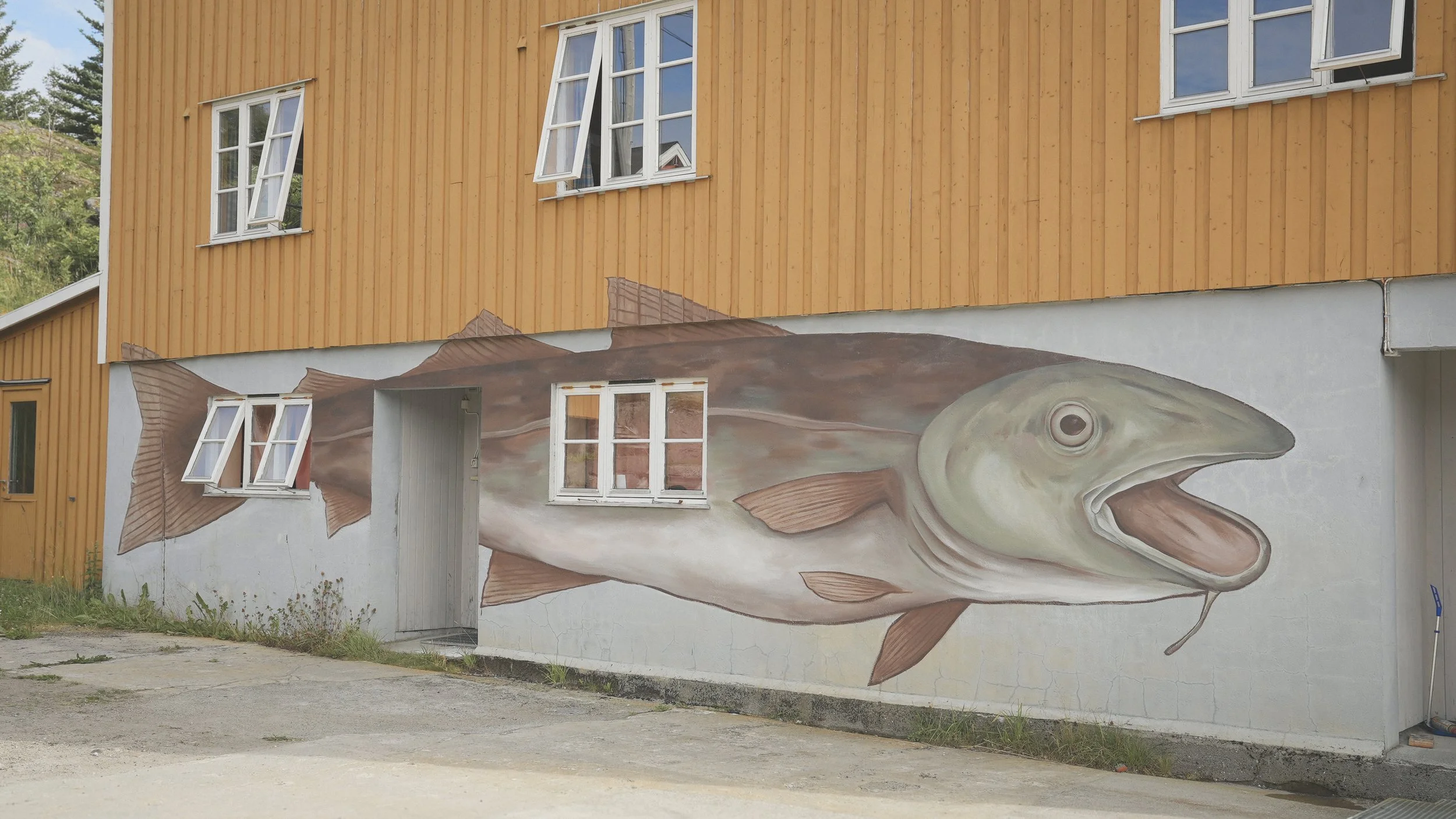I painted this huge cod fish on the main building of an old fish saltery in northern Norway. It was my greatest pleasure to spend some time on the beautiful Lofoten islands. Nature up there is absolutely breathtaking. Lofoten has a long history of cod fish production. The cod fishing industry has been the main source of income for most inhabitants on the islands. Wild cod for ‘stockfish’ is being caught in spring. After cleaning the fish, all of them are being dried on huge wooden constructions. The fresh air and arctic wind, helps the fish to dry out completely. Cod is still very important for this part of Norway. I wanted to honour this tradition, by painting a huge cod on this wall. In addition to this painting, I also created a brand new hostel logo.